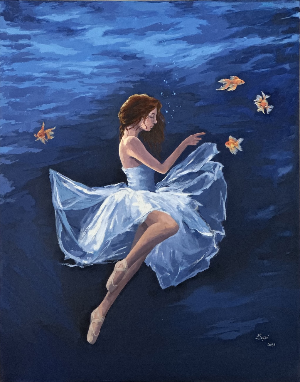 This painting brings to life the enchanting underwater world. The painting features a woman in a dress, dancing in the deep blue ocean, surrounded by golden fish.